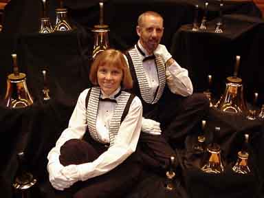 Bell a deux, (Handbell duet) Lancaster, PA. - Bobbi Schmid thezoo213@dejazzd.com and Ron Bellamy Ringinron@comcast.net - http://home.comcast.net/~belladeux -- Bell a deux is a professional handbell duo from the Lancaster County area of Pennsylvania. Bobbi Schmid and Ron Bellamy have combined over 54 years of ringing experience into this unique and highly energized partnership that was created in 1999. Together, they ring four octaves of Schulmerich handbells and three octaves of Malmark choirchimes to perform a varied repertoire which includes classical, sacred, jazz, rag, and "just-plain-fun" pieces. They are dedicated to promoting the art of solo, duet, and small ensemble ringing by teaching workshops and performing concerts around the country. They have been featured performers at the Solo/Ensemble Extravaganzas (SEE) held in Colorado Springs in 2001, 2003, and 2005, at the AGEHR (American Guild of English Handbell Ringers) National Seminar held in Milwaukee in 2006, at the 2007 SEE conference held in Philadelphia, and at the AGEHR Area II Read&Ring Seminar in July 2008.